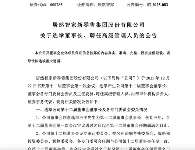 [环球网详尽报谈]12月23日,确凿智家发布公告称,公司于2025年12月22日召开第十二届董事会第一次会议,选举王宁为董事长,任期三年。同期,董事会成就审计委员会、提名和薪酬考察委员会、战术和投资委员会、预算委员会,各有益委员会的任期与董事会一致。