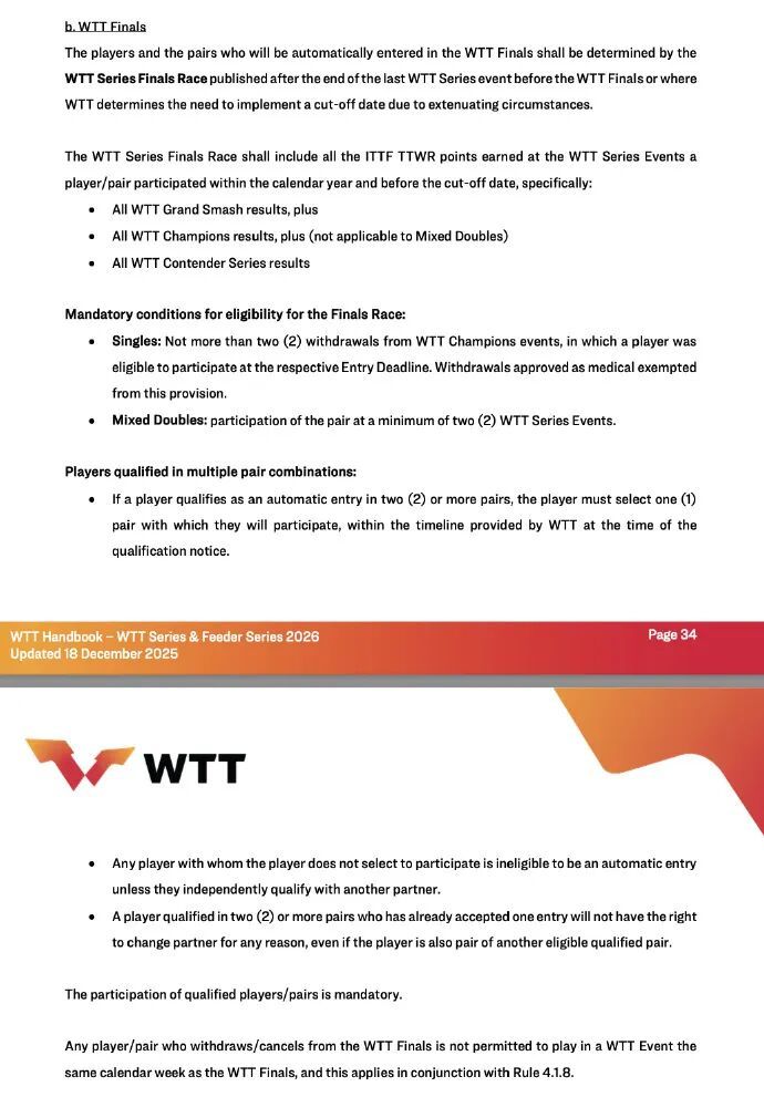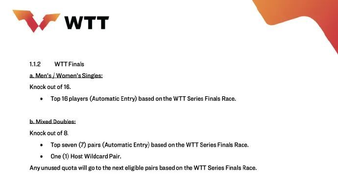 4.强制条件要求单打选手全年最多退赛2次(医疗原因豁免),混双组合需至少干涉2站WTT系列赛,不然影响履历。